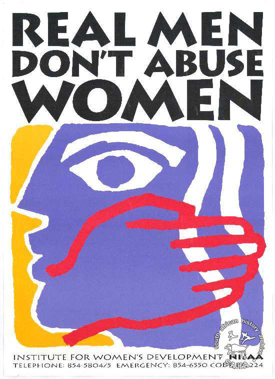 This poster is an offset litho in purple, red, black and yellow on white. The image is of a stylized women's face with a red outline of a hand over it. The text, in full, reads: "REAL MEN DON'T ABUSE WOMEN : INSTITUTE FOR WOMEN'S DEVELOPMENT NISAA : TELEPHONE: 854-5804/5 EMERGENCY: 854-6550 CODE BA 224".