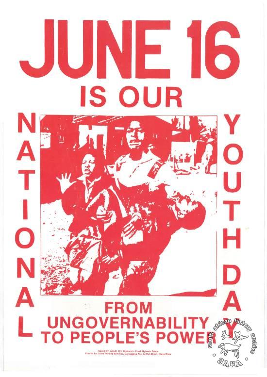 This poster is an offset litho in red and white. It features an image of Hector Pieterson. The text reads: "JUNE 16 NATIONAL YOUTH DAY IS OURS FROM UNGOVERNABILITY TO PEOPLE'S POWER : Issued by: ASAC, 876 Klipfontein Road ".