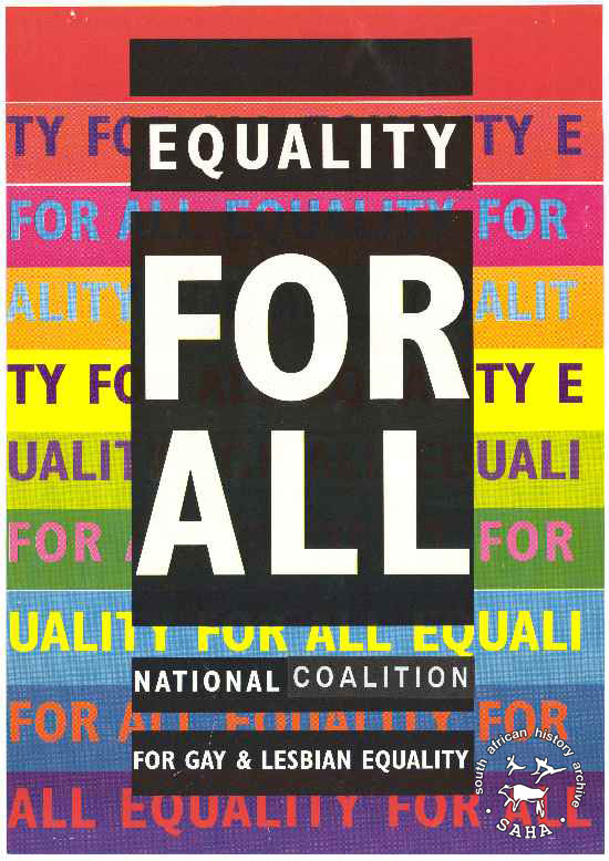 This poster is an offset litho in full of colour. The text reads: "EQUALITY FOR ALL; NATIONAL COALITION FOR GAY & LESBIAN EQUALITY".