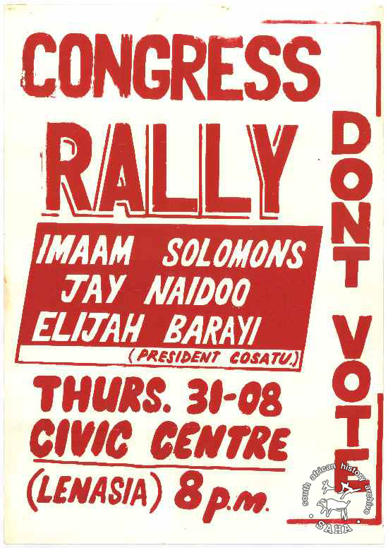 This poster is silkscreened, red on white. The caption reads: "CONGRESS RALLY DON'T VOTE : IMAAM SOLOMONS : JAY NAIDOO : ELIJAH BARAYI : (PRESIDENT COSATU) : THURS. 31-08 : CIVIC CENTRE : (LENASIA) 8p.m.". |