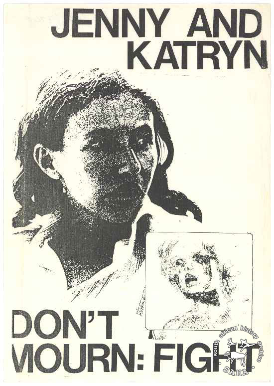 This poster is an offset litho in black and white. It features photographs of two young girls. The text reads: "JENNY AND KATRYN; DON'T MOURN: FIGHT."