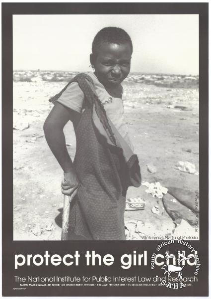 Black and white poster. Photograph of a small girl at Winterveld, North of Pretoria, by Paul Alberts. Issued by the National Institute for Public Interest Law and Research |