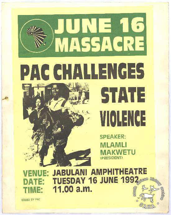 This poster is an offset litho in black, green and yellow issued by the Pan-Africanist Congress (PAC) in 1992. It features a photograph of Hector Pieterson. The text reads: "JUNE 16 MASSACRE; PAC CHALLENGES STATE VIOLENCE : SPEAKER: : MLAMULI : MAKWETU : (PRESIDENT) : VENUE: JABULANI AMPHITHEATRE : DATE: TUESDAY 16 JUNE 1992 : TIME: 11.00 a.m. : ISSUED BY PAC Taj Printers 422-3172/3".