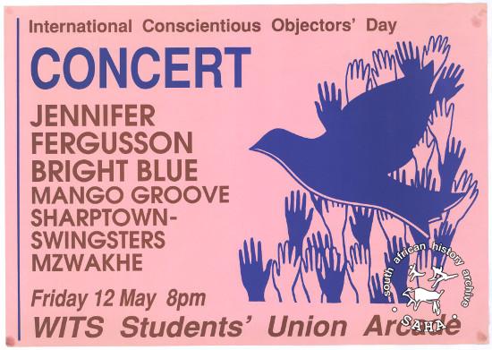 This is an offset litho poster in pink, brown and blue for an International Conscientious Objectors' Day Concert at the Wits Students' Union Arcade on Friday 12 May, year unknown. The text reads: "International Conscientious Objectors' Day Concert : JENNIFER FERGUSSON : BRIGHT BLUE : MANGO GROOVE : SHARPTOWN-SWINGSTERS : MZWAKHE". This poster was digitised by Specialised Archival Solutions in 2009. Included in the SAHA physical and / or virtual exhibitions 'What you won't hear on the radio' developed to mark the 30th birthday of Shifty Records and the 25th anniversary of the Voƫlvry tour. |