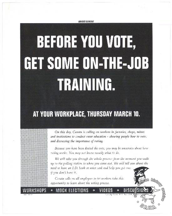 This poster is silkscreened in black and white. The main text reads: "BEFORE YOU VOTE : GET SOME ON-THE-JOB TRAINING : AT YOUR WORKPLACE, THURSDAY MARCH 10". There is also extensive text about a Cosatu voter education initiative. The bottom right-hand corner reads: "Issued by Cosatu, P.O. Box 1019 Johannesburg, 2000". |