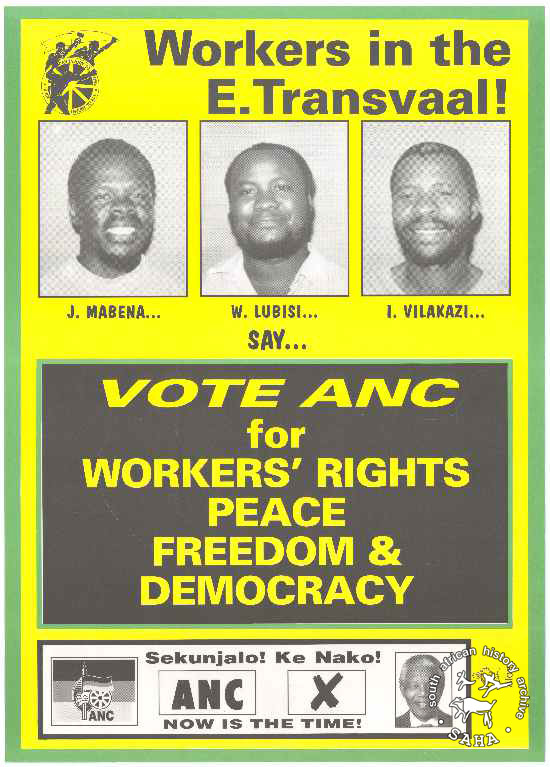 This poster is an offset litho in black, green and yellow. The poster also features three photographs of the named workers, the COSATU logo and an ANC "NOW IS THE TIME" election graphic including a photograph of Nelson Mandela. The caption reads: "Workers in the : E. Transvaal! : J. MABENA... W. LUBISI... I. VILAKAZI... : SAY... : VOTE ANC : for : WORKERS' RIGHTS : PEACE: FREEDOM & : DEMOCRACY". |