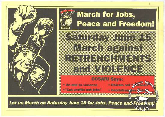 This poster is silkscreened in black, yellow and red. It features graphics of workers. The text reads: "March for Jobs, : Peace and Freedom! : Saturday June 15 : March against : RETRENCHMENTS : and VIOLENCE : COSATU Says: : • An end to violence • Retrain not "retrench" : • "Cut profits not jobs" • Capitalism has failed : Let us March on Saturday June 15 for Jobs, Peace and Freedom!". |