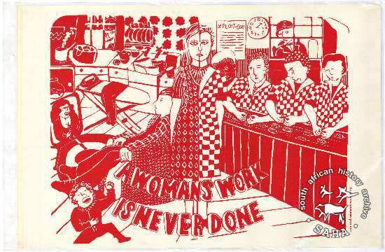 This poster is a screen print in red ink on white paper. The image is of a woman split in half between house and work. The text reads: "A womans work is never done". Information for this image was found on the Victoria and Albert website; their collection includes a copy of the same poster, museum number E1714-2004.
