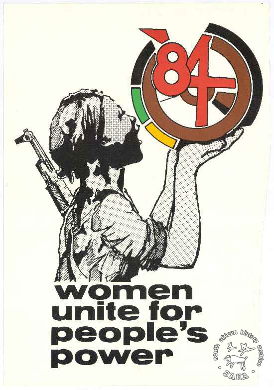 This poster is an offset litho in red, green and brown. The image is of a woman in military garb and with a gun on her back holding a logo in her hands (possibly modified ANC logo?). The text reads: "WOMEN UNITE FOR PEOPLE'S POWER '84".