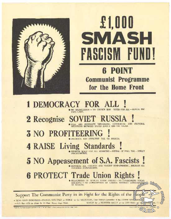 This poster is silkscreened in black and white with graphics and text. The text reads: "SMASH FASCISM : FUND 6 POINT COMMUNIST PROGRAMME : FOR THE HOME FRONT : DEMOCRACY FOR ALL! : Recognise SOVIET RUSSIA! : NO PROFITEERING! : RAISE Living Standards! : NO Appeasement of S.A Fascists! : PROTECT Trade Union Rights!". |