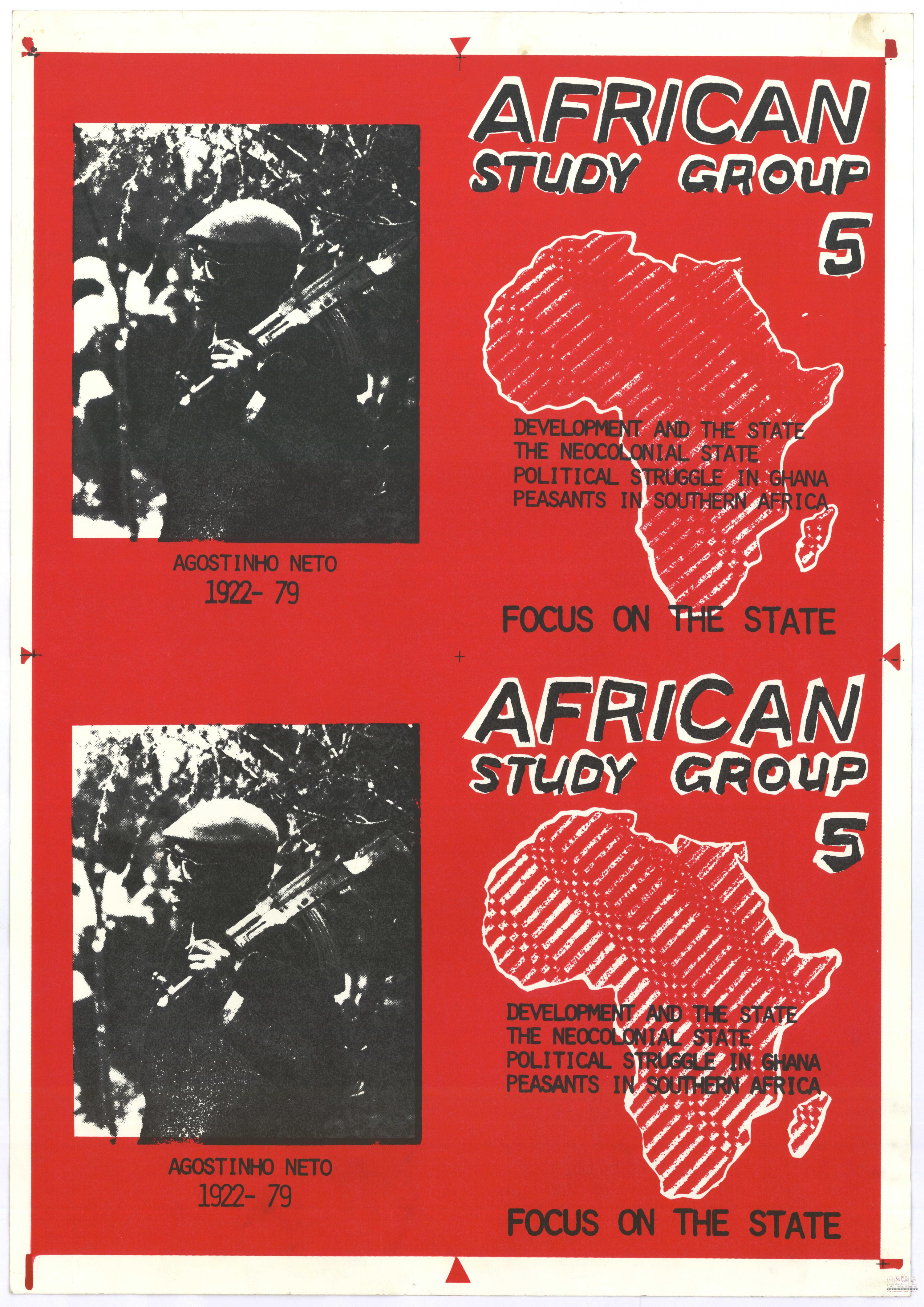 Silkscreen, red, black. Image and text repeats twice on the poster. Poster contains two photographs of Agostinho Neto - 1922-1979. Artwork of two maps of Africa. Poster announces African Study Group 5 on the " DEVELOPMENT AND THE STATE THE NEOCOLONIAL STATE POLITICAL STRUGGLE IN GHANA PEASANTS IN SOUTHERN AFRICA". |