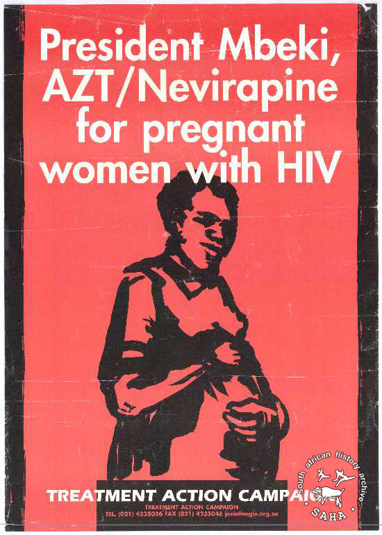 This poster is an offset litho in red, white and black. The main image is a drawing of a pregnant woman. The text reads: "PRESIDENT MBEKI, : AZT/Nevirapine : for pregnant : women with HIV : TREATMENT ACTION CAMPAIGN : TREATMENT ACTION CAMPAIGN : TEL. (021) 4235026 FAX (021) 4235046 josie@ncgle.org.za".
