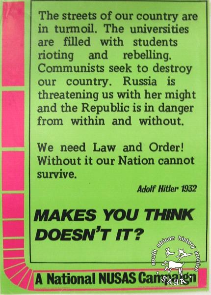 This poster is an offset litho in black, green and pink, produced by NUSAS in 1985, Cape Town. This is a NUSAS campaign poster which quotes Hitler as a comment on South Africa. The text reads “The streets of our country are in turmoil. The universities are filled with students rioting and rebelling. Communists seek to destroy our country. Russia is threatening us with her might and the Republic is in danger from within and without. We need Law and Order! Without it our Nation cannot survive. Adolf Hitler 1932 : MAKES YOU THINK DOESN'T IT?”Digitised by Specialised Archival Solutions in 2009. Reproduced in "Images of Defiance: South African Resistance posters in the 1980s" on page 116 (number 211) of the 1991 SAHA / Ravan Press edition |