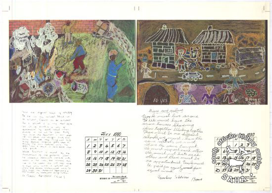 This is poster calendar in full coloured painting of children and adults with illustrations of the surroundings |