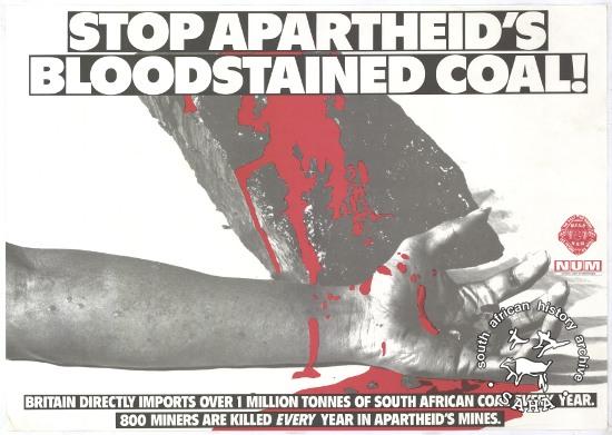 This silkscreened poster with a bloodstained black and white picture of an arm with coal, was issued by the National Union of Mineworkers (NUM) in 1989. The text reads: "STOP APARTHEID'S BLOODSTAINED COAL!" This poster was digitised by Specialised Archival Solutions in 2009.