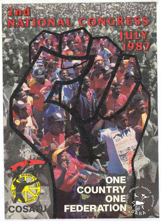 This poster is an offset litho in full colour, produced by COSATU, Johannesburg. This poster was produced to advertise the Second National Congress of COSATU. The text reads: "2nd NATIONAL CONGRESS JULY 1987 : ONE COUNTRY : ONE FEDERATION".Digitised by Specialised Archival Solutions in 2009. Reproduced in "Images of Defiance: South African Resistance posters in the 1980s" on page 55 (number 87) of the 1991 SAHA / Ravan Press edition and the 2004 SAHA / STE Publishers edition. |