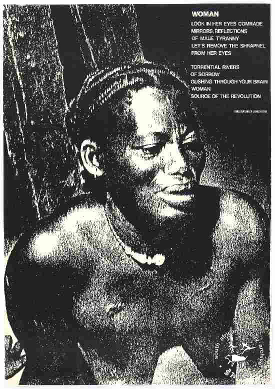 This poster is an offset litho in black. It features a photograph of a woman and the poem "Woman" by Abduraghiem Johnstone. The text, in full, reads: "WOMAN : LOOK IN HER EYES COMRADE : MIRRORS, REFLECTIONS : OF MALE TYRANNY : LET'S REMOVE THE SHRAPNEL : FROM HER EYES : : TORRENTIAL RIVERS : OF SORROW : GUSHING THROUGH YOUR BRAIN : WOMAN : SOURCE OF THE REVOLUTION : ABDURAGHIEM JOHNSTONE"
