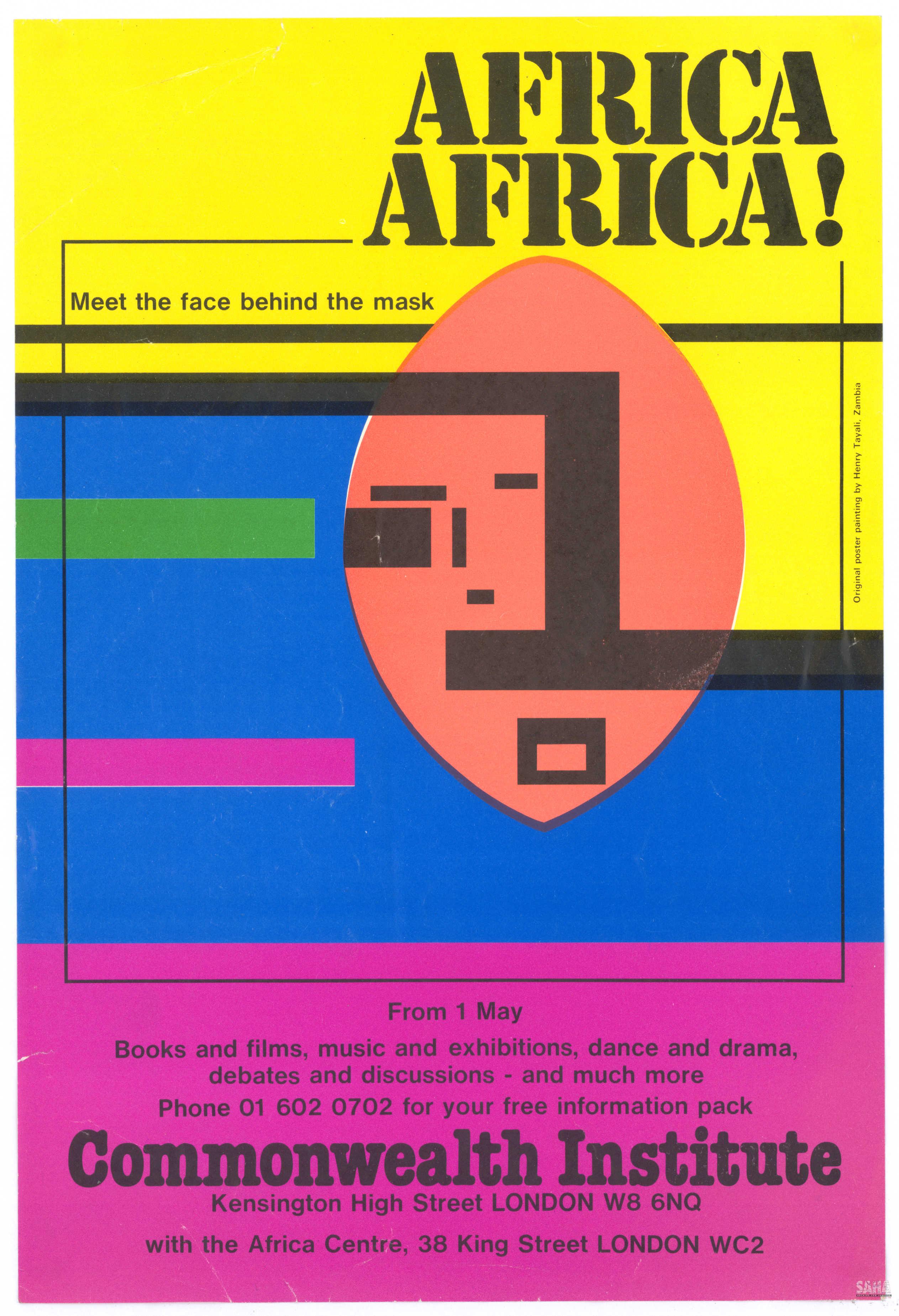 Multicoloured poster giving notice of an exhibition at the Commonwealth Institute, Kensington High Street, in London, from 1st May on books, films, drama, music and dance . Artwork includes a stylised mask. Text reads "Africa, Africa! meet the face behind the mask". |