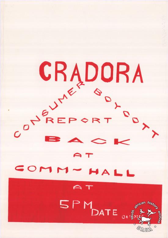 This poster is silkscreened red, produced by the Cradock Residents Association (CRADORA), Johannesburg. This poster encouraged Cradock residents to attend a report-back meeting that related to a consumer boycott based in the town. The text reads “CRADORA: CONSUMER BOYCOTT: REPORT BACK AT COMM - HALL” Digitised by Specialised Archival Solutions in 2009. Reproduced in "Images of Defiance: South African Resistance posters in the 1980s" on page 77 (number 132) of the 1991 SAHA / Ravan Press edition and the 2004 SAHA / STE Publishers edition. |