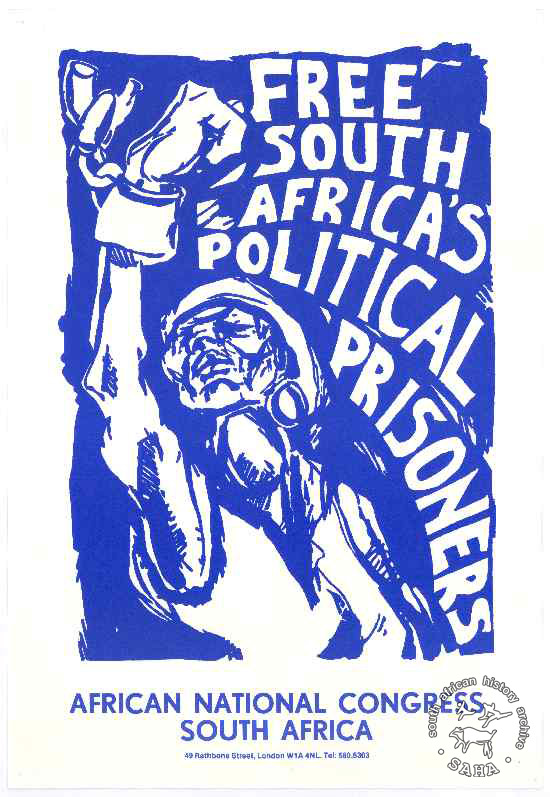 This poster is an A3 poster in blue. The image is of a woman with her fist raised, holding a broken chain. The text reads: "Free South Africa's Political Prisoners : AFRICAN NATIONAL CONGRESS : SOUTH AFRICA : 49 Rathbone Street, London W1A 4NL. Tel. 580.5303".