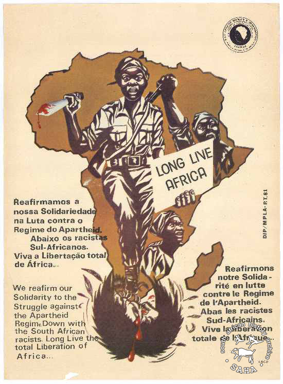 This is an A2 poster in black, yellow and white. The text is written in French, Portuguese and English, and states solidarity with anti-Apartheid struggle.