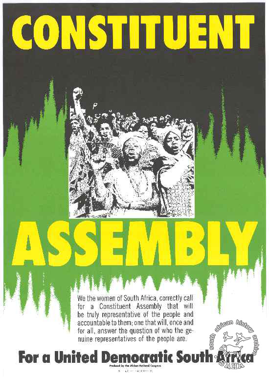 This poster is an A2 poster in black, yellow and green and white. The central image is a black and white photograph of protesting women. The text reads: "CONSTITUENT : ASSEMBLY : We the women of South Africa correctly call for a Constituent Assembly that will be truly representative of the people and accountable to them; one that will, once and for all, answer the question of who the genuine representatives of the people are. : For a United Democratic South Africa : Produced by the African National Congress : Printed by Anderson Fraser (071 6078811)".