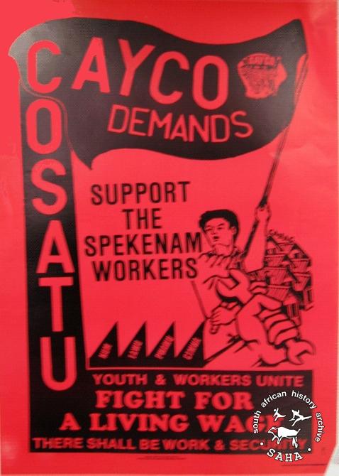 This poster is an offset litho in black and red, produced by the Cape Youth Congress (CAYCO). This poster depicts how CAYCO identifies with COSATU and striking workers from FAWU. The text reads “CAYCO COSATU Demands: Support the Spekenam workers; Youth and workers unite fight for a living wage” Digitised by Specialised Archival Solutions in 2009. Reproduced in "Images of Defiance: South African Resistance posters in the 1980s" on page 79 (number 138) of the 1991 SAHA / Ravan Press edition |