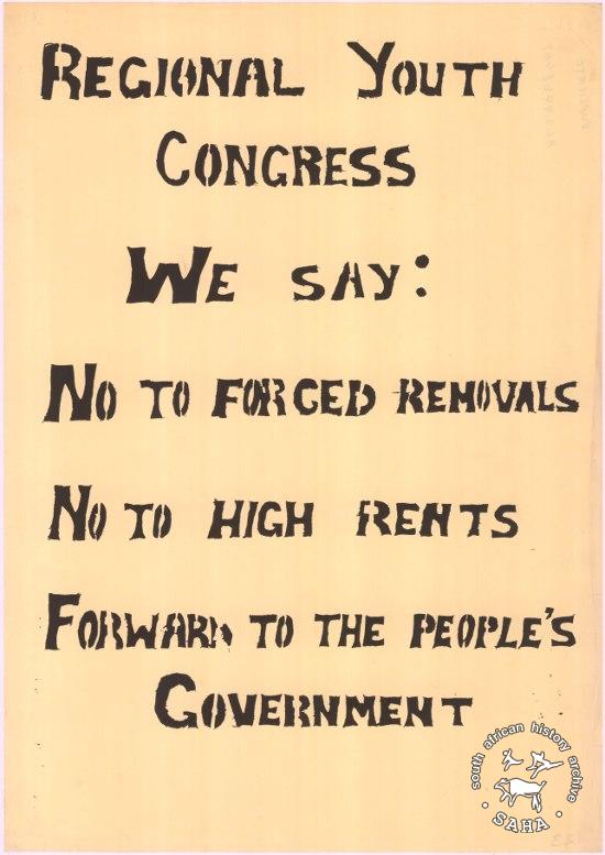 ► 467 :: REGIONAL YOUTH CONGRESS WE SAY: NO TO FORCED REMOVALS : NO TO HIGH RENTS : FORWARD TO THE PEOPLE'S GOVERNMENT