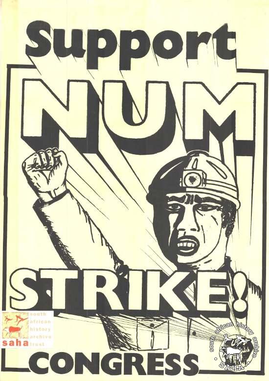 This is a silkscreened poster, issued by the United Democratic Front (UDF) and the text reads: "Support NUM STRIKE!: CONGRESS". This poster was digitised by Colourline in 2009.