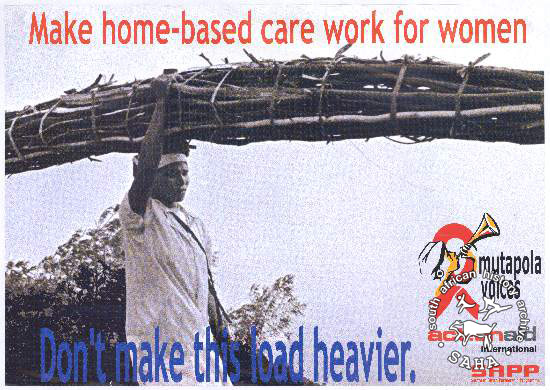This A1 posters is printed in full colour. The main image is a photograph of a woman carrying a bundle of sticks on her head. Logos for ActionAid, South Africa Partnership Program (SAPP) and mutapola voices. The main text reads: "Make home-based care work for women : Don't make this load heavier."