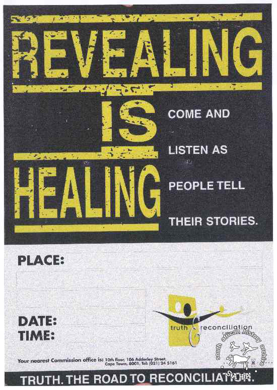 "Revealing is Healing- come and listen as people tell their stories. Truth. The road to reconcilation |