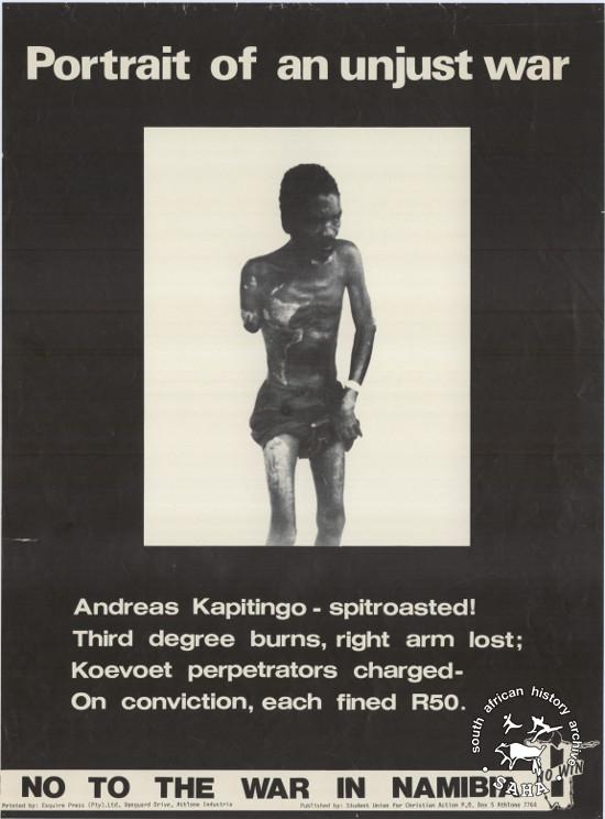 Portrait of an unjust war : Andreas Kapitingo - spitroasted! : Third degree burns, right arm lost; Koevoet perpetrators charged- On conviction, each fined R50 : NO TO THE WAR IN NAMIBIA |