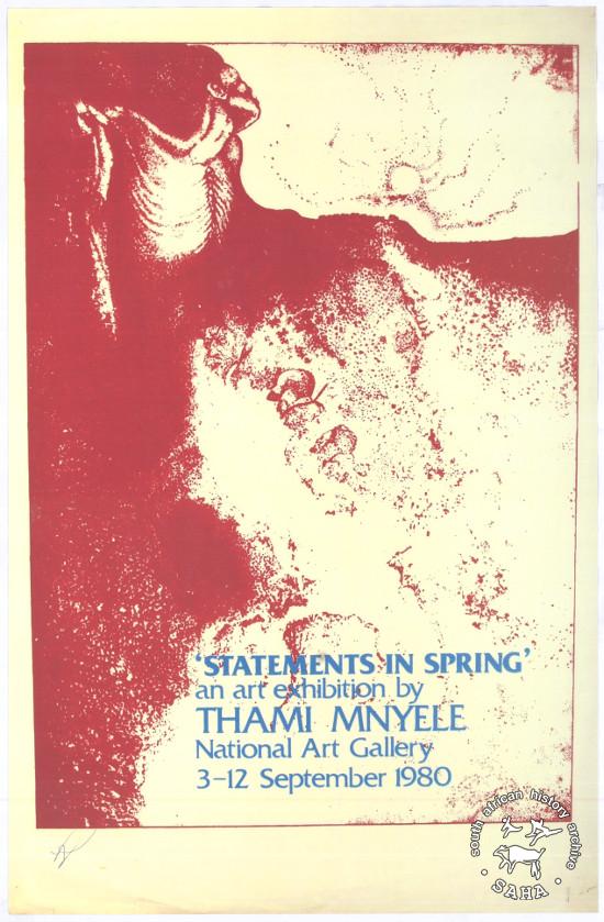 This is an offset litho poster in red and yellow, produced by the Medu Art Ensemble for an art exhibition by Thami Mnyele in Botswana, called 'Statements in spring', 1980. This poster was digitised by Specialised Archival Solutions in 2009. |