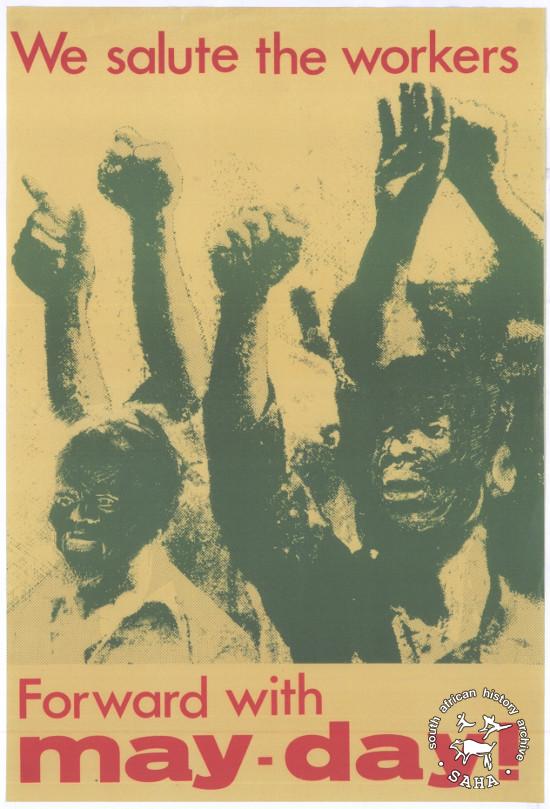 This is an offset litho poster in green, yellow and red, produced by the Medu Art Ensemble, date unknown. The text reads:"We salute the workers! Forward with May-Day!" The poster was digitised by Specialised Archival Solutions in 2009. |