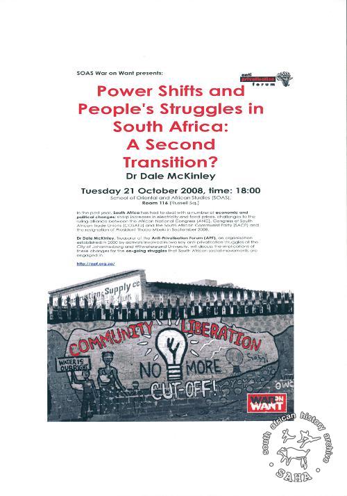 This offset litho poster was produced by the Anti-Privatisation Forum (APF) in 2008 and the text reads: "APF : Anti-Privatisation Forum : SOAS War on Want presents: Power Shifts and People's Struggles in South Africa: A Second Transition? : Dr Dale McKinley.