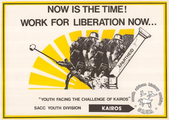 This poster is an offset litho in black and yellow, produced by the SACC Youth Division in 1985, Johannesburg. This poster refers to a call for Christian youth to join the struggle against apartheid. The text reads “NOW IS THE TIME! : WORK FOR LIBERATION NOW... : "YOUTH FACING THE CHALLENGE OF THE KAIROS”Digitised by Specialised Archival Solutions in 2009. Reproduced in "Images of Defiance: South African Resistance posters in the 1980s" on page 98 (number 184) of the 1991 SAHA / Ravan Press edition |