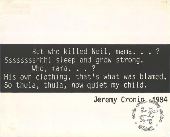 This poster is silkscreened black, produced by STP in 1984, Johannesburg. This poster refers to a verse from a poem about death in detention. The text reads “But who killed Neil, mama...? Sssssssshhh! sleep and grow strong. Who, mama...? His own clothing, that's what was blamed. So thula, thula, now quiet my child.” Digitised by Specialised Archival Solutions in 2009. Reproduced in "Images of Defiance: South African Resistance posters in the 1980s" on page 153 (number 280) of the 1991 SAHA / Ravan Press edition. |