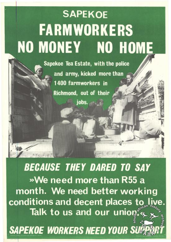 This poster is an offset litho in black and green, produced by the Food and Allied Workers Union (FAWU), Durban. This poster depicts how the Food and Allied Workers Union (FAWU) exposed the oppressive working conditions on a tea estate and how they demanded union recognition. The text reads “SAPEKOE FARMWORKERS : NO MONEY NO HOME” Digitised by Specialised Archival Solutions in 2009. Reproduced in "Images of Defiance: South African Resistance posters in the 1980s" on page 65 (number 113) of the 1991 SAHA / Ravan Press edition and the 2004 SAHA / STE Publishers edition. It also appears on page 117 of “Red on Black: The Story of the South African Poster Movement”, SAHA / STE Publishers, 2007 |