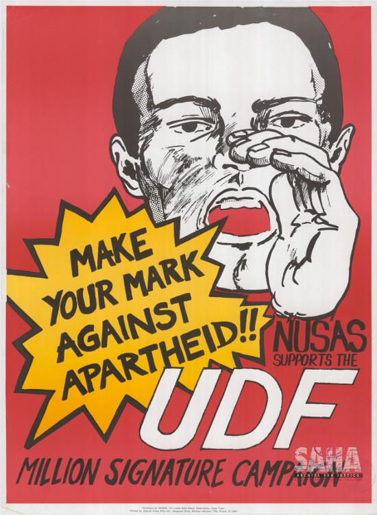 The text reads: 'Make your mark against apartheid: NUSAS supports the UDF million signature campaign'. Digitised by Specialised Archival Solutions in 2009. Reproduced in "Images of Defiance: South African Resistance posters in the 1980s" of the 1991 SAHA / Ravan Press edition. |