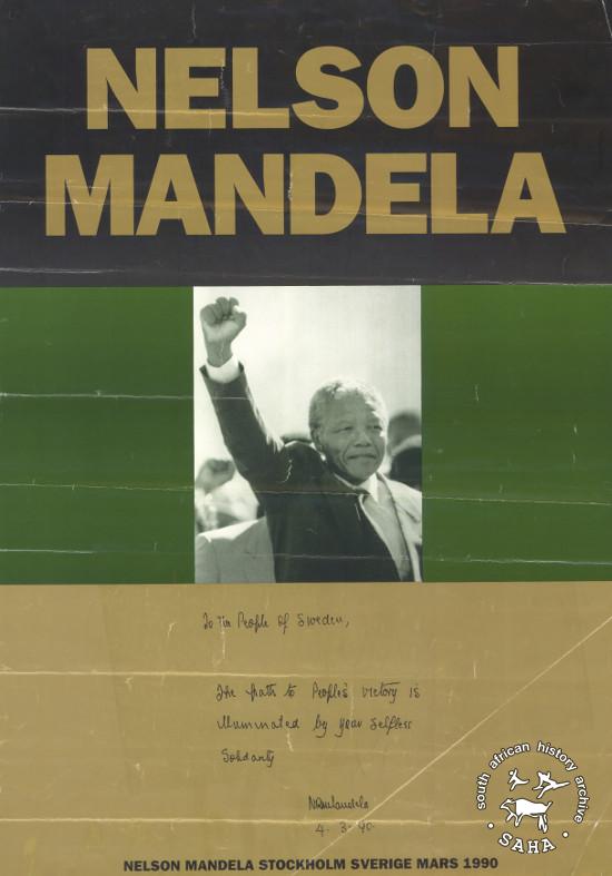 This is an offsite litho poster, issued by an unidentified Swedish solidarity group in 1990. The text reads: "NELSON MANDELA : To the People of Sweden, : The path to People's victory is illuminated by your selfless solidarity : NR Mandela : 4.3.90. : NELSON MANDELA STOCKHOLM SVERIGE MARS 1990". This poster was digitised by Specialised Archival Solutions in 2009. |