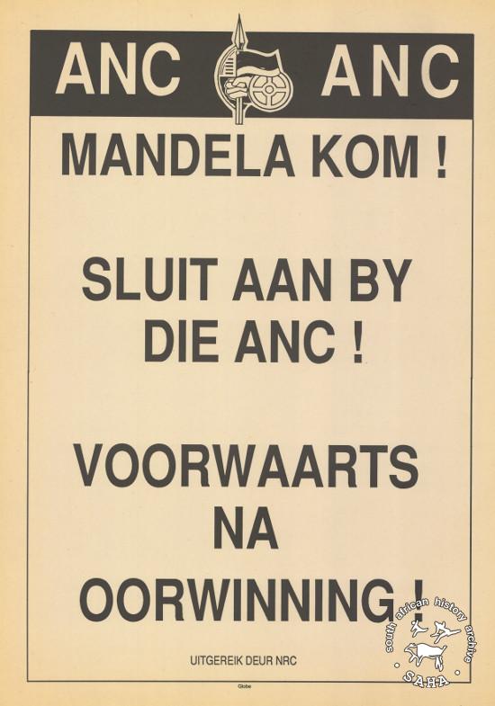 This is an offset litho poster, issued by the National Reception Committee (NRC), circa 1990. The text is in Afrikaans and reads: "MANDELA KOM! SLUIT AAN BY DIE ANC! VOORWAARTS NA OORWINNING!" This poster was digitised by Specialised Archival Solutions in 2009. |