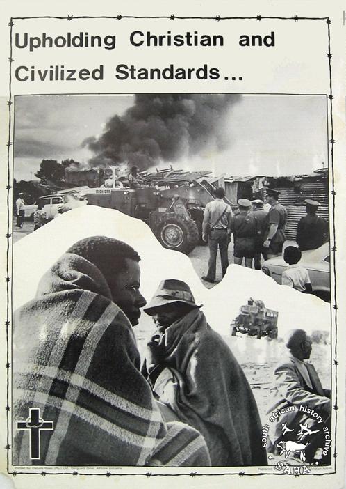 This poster is an offset litho in black, produced by the Student Union for Christian Action (SUCA), Cape Town. This poster depicts the cruelty of a so-called Christian state. The text reads “Upholding Christian and Civilized Standards ...” Digitised by Specialised Archival Solutions in 2009. Reproduced in "Images of Defiance: South African Resistance posters in the 1980s" on page 97 (number 180) of the 1991 SAHA / Ravan Press edition. |