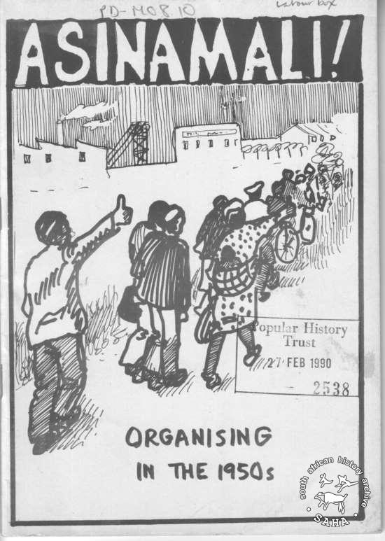 This is the front cover of the booklet, titled 'ASINAMALI! Organising in the 1950s'. Date unknown. The cover was digitised by SAHA in 2012.