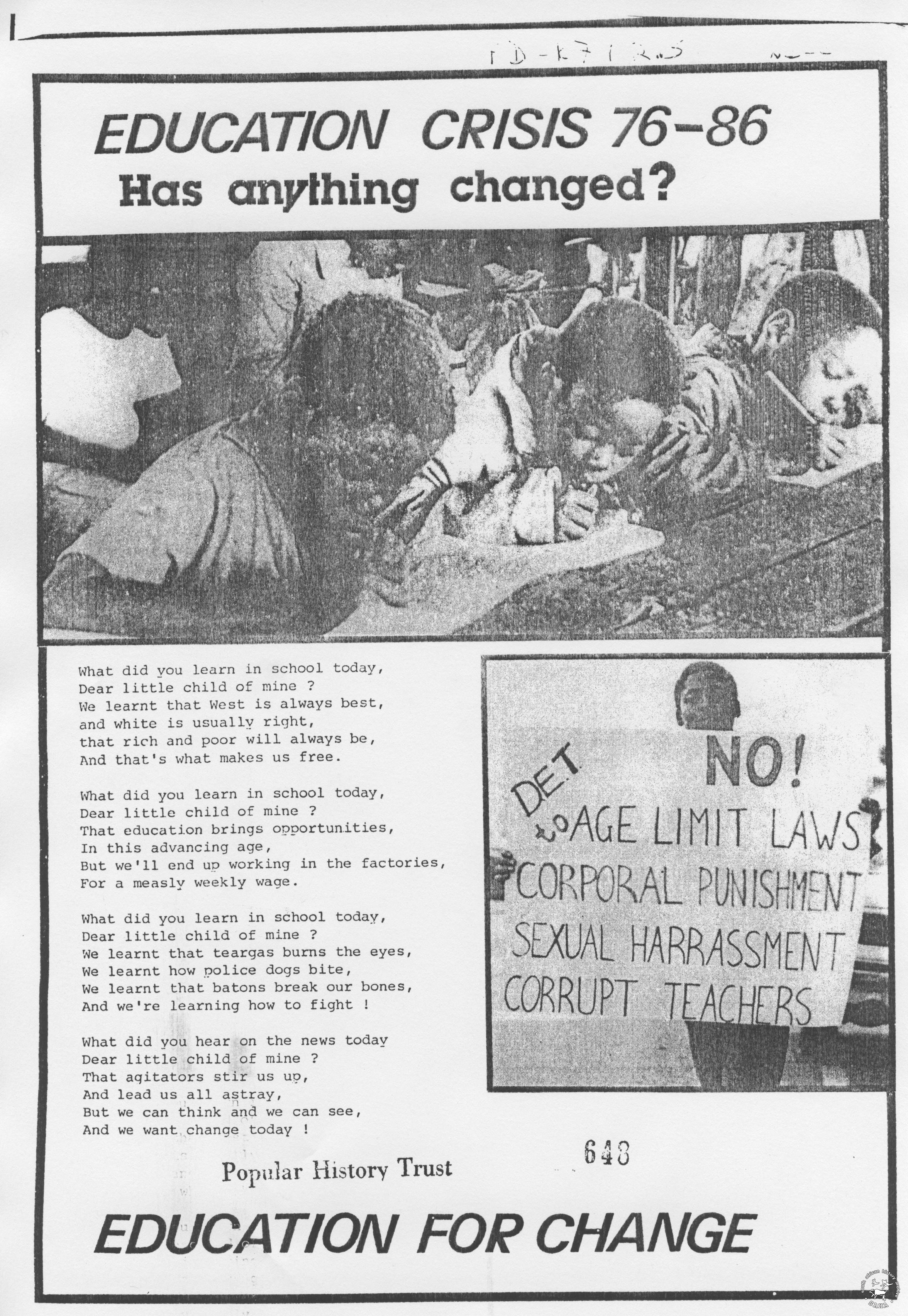 This is a poem in a publication by the National Education Crisis Committee. Its pointing out how the apartheid education system was affecting the black children and how it aimed to brainwash the youth. |