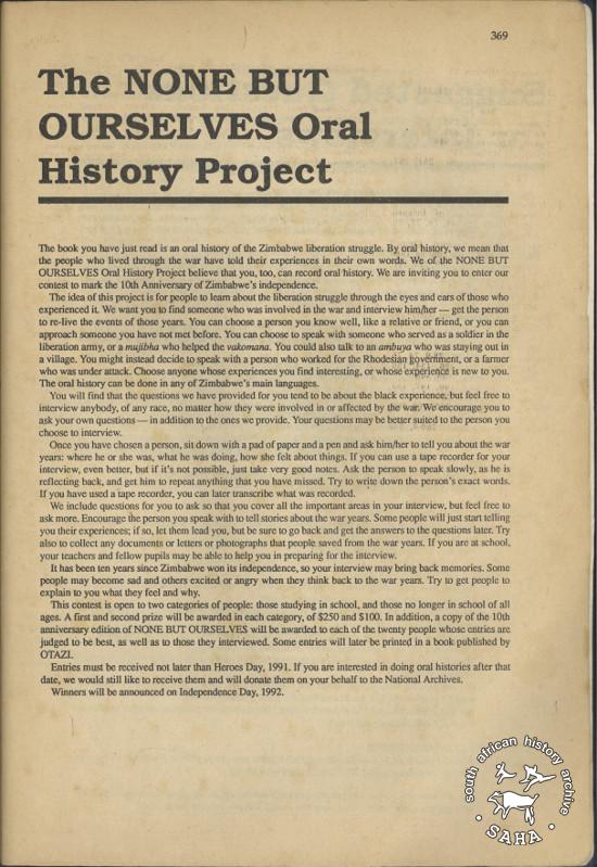 This is a digital image of the first page of a three page addition 'The NONE BUT OURSELVES oral history project' to the 10th Anniversary of Independence edition of 'None But Ourselves: Masses vs Media in the Making of Zimbabwe', published by Anvil Press in 1990. This item was digitised by Specialised Archival Solutions in 2015 for inclusion in Julie Frederikse's 'Author's Reflection' for the new edition of "The Unbreakable Thread: non-racialism in South Africa". Also included in the SAHA online repository 'Tracing the unbreakable thread: non-racialism in South Africa today' |
