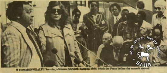 This is a digital copy of a clipping from the "Times of Zambia" of 4 August 1979 showing a photograph of the Commonwealth Secretary-General being interviewed by Julie Frederikse at a press conference. The caption reads: "COMMONWEALTH Secretary-General Shridath Ramphal (left) briefs the Press before the summit started." This newsclipping was digitised by SAHA in 2015 for inclusion in Julie Frederikse's 'Author's Reflection' for the new edition of "The Unbreakable Thread: non-racialism in South Africa". Also included in the SAHA online repository 'Tracing the unbreakable thread: non-racialism in South Africa today' |