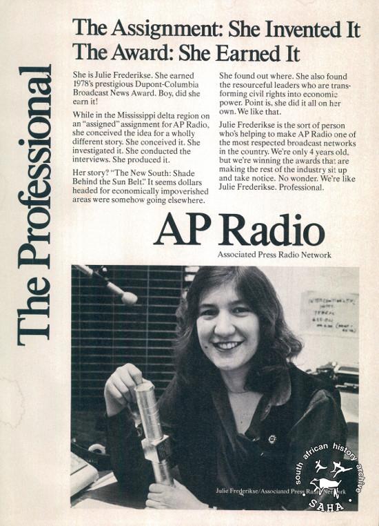 This is a digital copy of an advertisement for AP Radio featuring Julie Frederikse as the professional and award-winning journalist who helps to make AP Radio one of the most respected broadcast networks in the country, circa 1979. The text reads in part: "The Professional : The Assignment: She Invented It : The Award: She Earned It : AP Radio..." This item was digitised by SAHA in 2015 for inclusion in Julie Frederikse's 'Author's Reflection' for the new edition of "The Unbreakable Thread: non-racialism in South Africa". Also included in the SAHA online repository 'Tracing the unbreakable thread: non-racialism in South Africa today' |