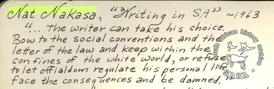 This is a digital copy of a quote from exiled black South African journalist Nat Nakasa's "Writing in SA" (1963), as copied over by Julie Frederikse in her journal 3. This item was digitised by SAHA in 2015 for inclusion in Julie Frederikse's 'Author's Reflection' for the new edition of "The Unbreakable Thread: non-racialism in South Africa". Also included in the SAHA online repository 'Tracing the unbreakable thread: non-racialism in South Africa today' |
