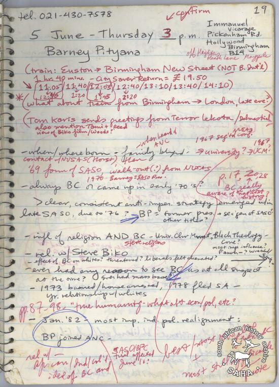 This is page fifteen of Julie Frederikse's notebook she kept for scheduling the interviews she conducted, circa 1986 and 1987. On this page she has scheduled an interview with Barney Pityana. This item was digitised by Specialised Archival Solutions in 2015. This page of the notebook is included in Julie Frederikse's 'Author's Reflection' for the new edition of "The Unbreakable Thread: non-racialism in South Africa". Also included in the SAHA online repository 'Tracing the unbreakable thread: non-racialism in South Africa today' |