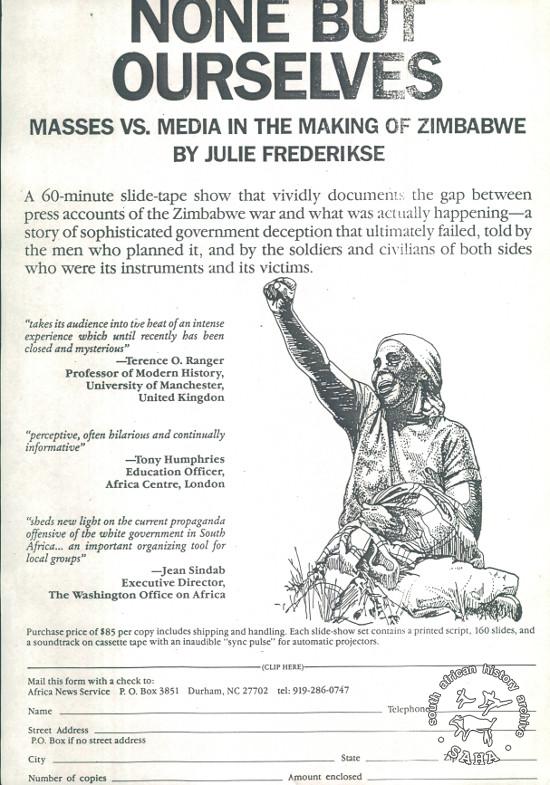 This is a digital copy of the order form for the None But Ourselves 60 minute audio-visual show, produced by Julie Frederikse with Africa News, circa 1983. It premiered at London's Africa Centre in December 1983 and was shown widely in Zimbabwe. The South African premiere was at the first conference of the Congress of Trade Unions (COSATU) in 1985. Copies of the audio-visual show were distributed in South Africa by the National Education Union of South Africa (NEUSA) resource centre. This item was digitised by SAHA in 2015 for inclusion in Julie Frederikse's 'Author's Reflection' for the new edition of "The Unbreakable Thread: non-racialism in South Africa". Also included in the SAHA online repository 'Tracing the unbreakable thread: non-racialism in South Africa today' |